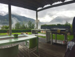 Die Küchenzeile aus Beton findet ihren Platz auf der großzügigen, überdachten Terrasse unseres Kunden. Mit dem atemberaubenden Ausblick auf die österreichischen Alpen lässt es sich bestens grillen. Da bereits ein Grill vorhanden ist, ist die vorgefertigte oneQ Outdoorküche eine praktische Ergänzung. Im Betonkorpus ist die Kaltwasserspüle "Wet" eingelassen, um sich während der Essensvorbereitung die Hände zu waschen oder das Gemüse zu reinigen. Außerdem hat sich unser Kunde für den Weinkühler "Ice" entschieden. In diesen werden Eiswürfel eingefüllt und den ganzen Abend kann unser Kunde gekühlten Wein und andere kalte Getränke vor dem fantastischen Panorama genießen. Die Betonarbeitsfläche bietet ausreichend Platz zum Vorbereiten und Anrichten der gegrillten Speisen. Auf dem hochwertigen Schneidebrett "Bamboo" lässt sich Gemüse oder Fleisch schneiden. Unterhalb der Arbeitsfläche befindet sich noch eine Ablagefläche aus Metall, um Zubehör schnell griffbereit zu haben.