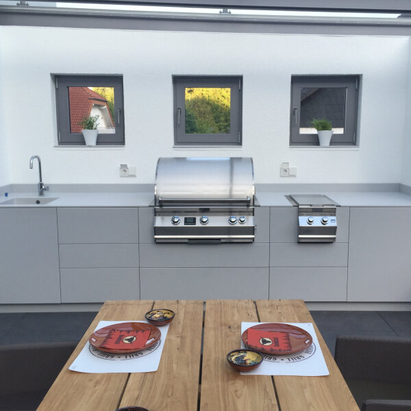 Eine Outdoorküche kann aus vielen verschiedenen Materialien bestehen - ob Holz, Stein oder Metall, es gibt viele Möglichkeiten, um den eigenen Geschmack in seinem Outdoorbereich umzusetzen. Unser Kunde hat sich für ein außergewöhnliches Material entschieden: einen Mineral-Acryl-Verbundstoff. Durch seine Flexibilität und Langlebigkeit ist der Verbundstoff aus Acryl nicht nur für Innenbereiche wie Küchen oder Bäder geeignet, sondern auch für den Outdoorbereich.Doch bevor der Verbundstoff zum Einsatz kommt, wurde auch in dieser Outdoorküche eine Konstruktion für die späteren Elemente errichtet. Auf der überdachten Terrasse befindet sich die Küche in einer gemauerten Nische hin zum Nachbarsgrundstück. Das besondere hieran sind die eingelassenen Fenster, um die Küche offener wirken zu lassen. Der Korpus der Outdoorküche bietet genug Platz für einen Fire Magic Aurora A540i Grill und passendem Seitenbrenner, sowie eine Spüle und ausreichend Arbeitsfläche. Die Unterkonstruktion ist mit Mineral-Acryl-Verbundstoff vom Schreiner verkleidet. Das flexible Material lässt sich fugenlos verarbeiten und ist pflegeleicht sowie antibakteriell. Besonders für eine Küche ist das kratzfeste Verbundstoff gut geeignet.